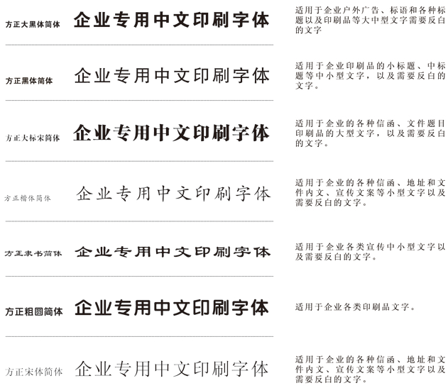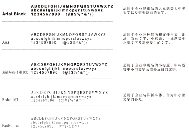 為使視覺(jué)形象更加統(tǒng)一,所有傳媒所用文字,均應(yīng)選用以下規(guī)定字體。字體允許向右傾斜20度,允許長(zhǎng)體90%―100%,扁體110%-120%。禁止使用其他字體,特性情況(如節(jié)日、慶典)設(shè)計(jì)例外。同時(shí),為求得運(yùn)用方便,在刊物,媒體及封面的排版上,若無(wú)相同字體時(shí),可選擇字形相近的字體替代使用。