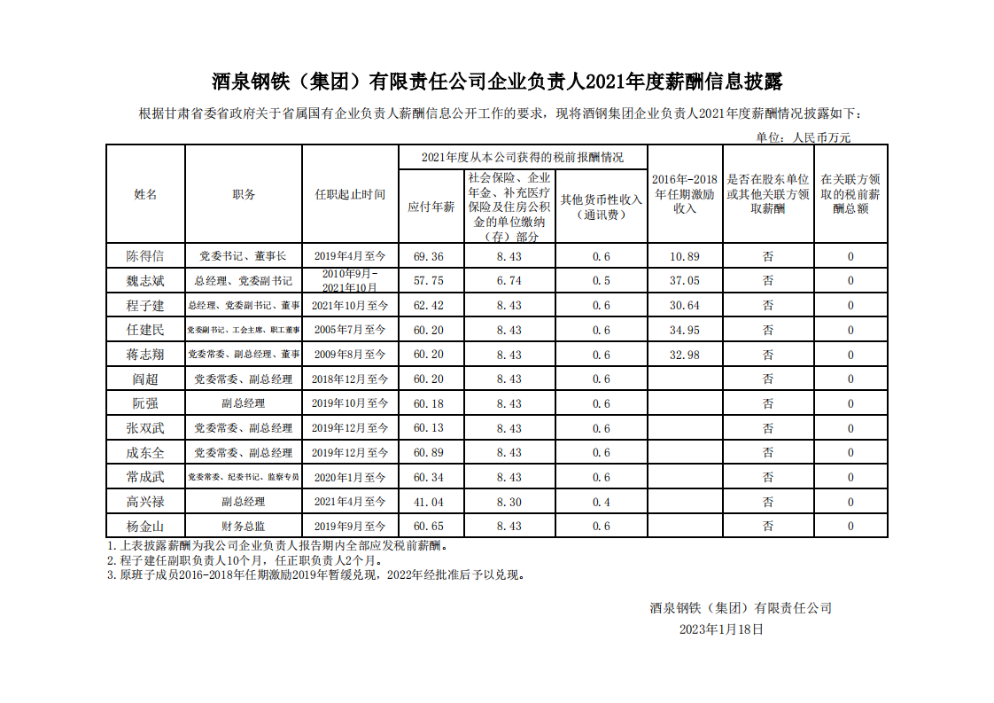 酒泉鋼鐵(集團(tuán))有限責(zé)任公司企業(yè)負(fù)責(zé)人2021年度薪酬信息披露