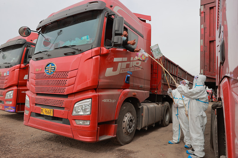 為統(tǒng)籌疫情防控和生產經營,宏興股份公司儲運部對外來貨運車輛采取“不下車、零接觸”的辦法,完成原料檢驗、過泵、卸貨工作,方便貨車司機順利卸車。同時,該部及時了解司機所需,提供車輛維修、代送餐水等便利服務,共同克服疫情帶來的不便。圖為儲運部職工為貨車司機提供暖心的送餐服務。